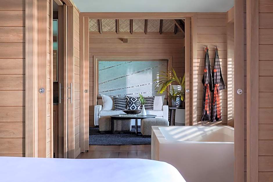 This luxurious over-water bungalow features a spacious living area opening onto a patio with 2 chaise lounges and beautiful lagoon views.